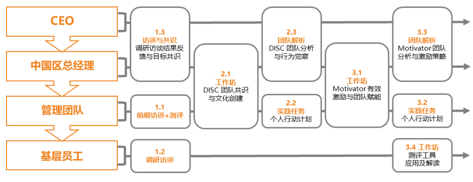 第一阶段为访谈调研:迅佰汇首先通过对管理团队及几位基层高潜人员的一对一访谈,收集归纳各层级对公司企业文化的基础印象,并应用测评工具对目标人群进行分析。其次,通过与企业高管深度访谈,快速共识并明确本次项目的核心目标及推进优先级。通过一阶段的访谈调研,高管团队深入了解核心管理层的行为风格与激励因子,企业明确了团队内部矛盾的焦点,也理解了员工对公司发展方向的诉求。